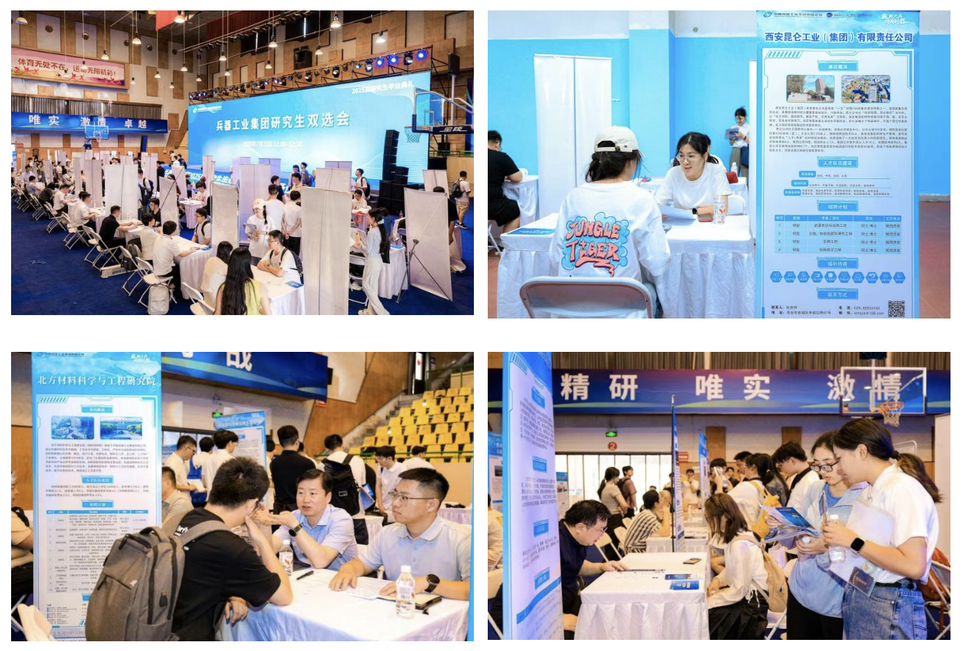 畢業(yè)生代表回顧成長歷程,感謝培養(yǎng)平臺與導(dǎo)師指導(dǎo),誓言投身國防事業(yè)。導(dǎo)師代表肯定學(xué)生科研淬煉的“嚴(yán)謹(jǐn)”與“擔(dān)當(dāng)”,寄語傳承人民兵工精神,在強(qiáng)軍報國中實(shí)現(xiàn)價值。校友代表以科研經(jīng)歷詮釋兵工人使命,勉勵學(xué)弟學(xué)妹以裝備成果接力書寫強(qiáng)軍報國答卷。全體師生共同唱響《強(qiáng)軍有我》,鏗鏘有力的歌聲回蕩在體育館內(nèi),既飽含著對青春理想的告白,更傳遞出投身國防事業(yè)的堅定信念,為這場畢業(yè)盛典增添了厚重的使命底色。 典禮的莊重氛圍未散,兩場精準(zhǔn)對接國防需求的雙選會已在相鄰場館同步開啟。60家集團(tuán)公司下屬單位的招聘人員與2025屆畢業(yè)生、在讀研究生及工程碩博士們圍坐洽談,圍繞崗位需求與項(xiàng)目方向,以簡歷和科研成果為媒展開深度對接。這場覆蓋多層次人才的就業(yè)服務(wù),精準(zhǔn)銜接科研人才儲備與國防需求,為兵器事業(yè)高質(zhì)量發(fā)展注入活力。  兵器工業(yè)集團(tuán)研究生雙選會現(xiàn)場